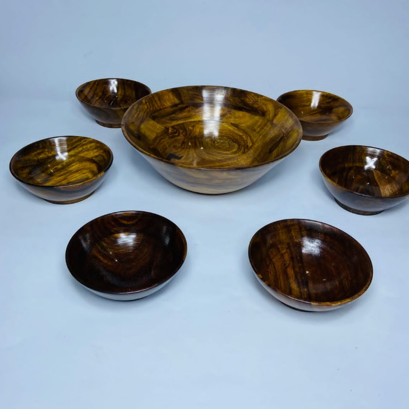 This wooden bowl set comprises seven pieces, each uniquely crafted from acacia wood. The bowls showcase a seamless blend of rustic charm and modern design, featuring smooth, curved edges and a polished finish. Varying in size, the set offers versatility for serving salads, snacks, or desserts. The natural grain patterns of the acacia wood add an organic touch, creating an inviting ensemble that complements both casual and formal table settings.
